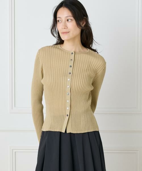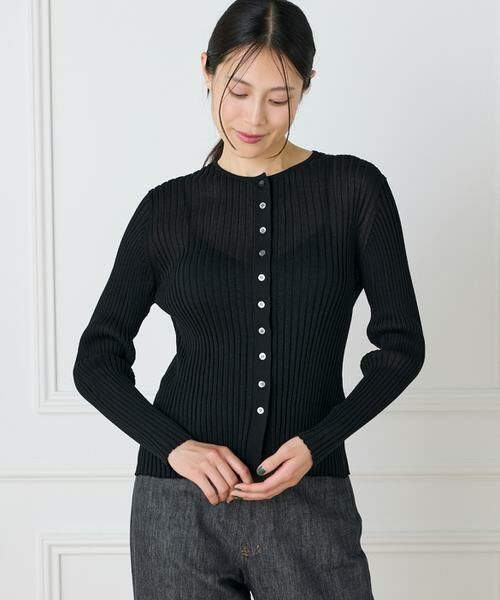 コンパクト丈でジャストフィットサイズのシアーリブカーディガン。シアー感とリブの表情のある質感に控えめなラメ感を加えて、華やかに仕上げています。(ベージュ:ラメ感なし/クロ:ラメ感あり) 詰まったクルーネックできちんと見えしつつ、多く付けたボタンがアクセントになっています。