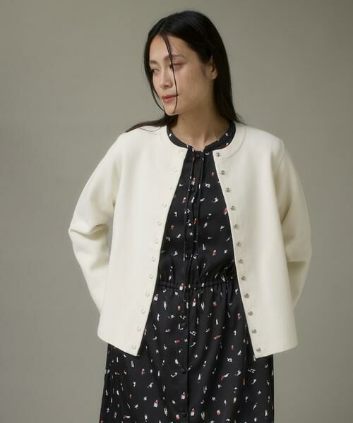 カーディガンとジャケットと間の仕上がりにするために表と裏で編み方を変えて編み立てています。ビスコースとポリエステルの糸をベースに細いポリエステル糸を加えて編み立てることで適度な張り感が生まれ、カジュアルアイテムをきれい目にブラッシュアップ。ストンとしたシルエットなのでボリュームが出過ぎないよう、サイズ感にこだわりました。