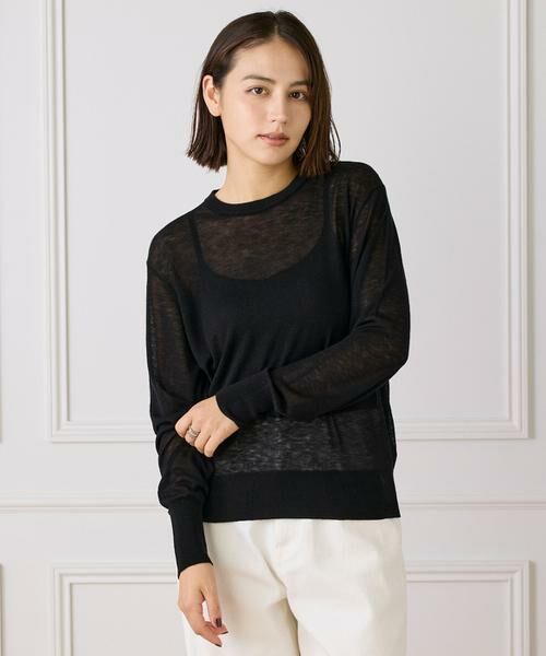 暑さの残る秋に欠かせないシアーニット。天竺編みで透けすぎず程よいシアー感を表現しています。ウールの温かみがありながらチクチクしにくくまた、非常に軽く、繊細でなめらかな着心地です。晩夏の早い時期から重ね着に使いやすく、秋はもちろん春先など長い期間に重宝します。スタイリングのアクセントになるきれいめカラーはシアー素材なので肌なじみが良く、普段選ばないカラーにもぜひチャレンジしてみてはいかがでしょうか?
