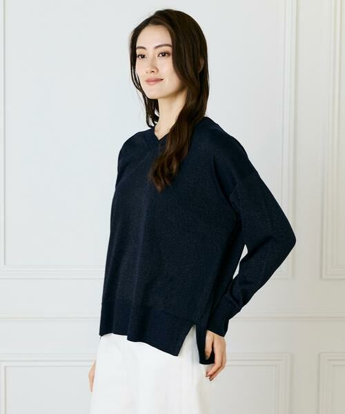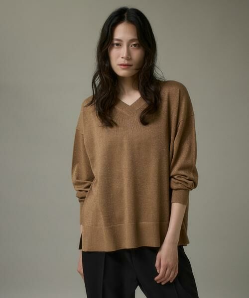 Vネック先を重ねた衿ぐりの開きがポイントのニットプルオーバー。程よいゆとりがあるので身体のラインを拾いにくいです。上品で繊細なグリッター感はシーンを選ばず、スリットを入れることでタックインしやすく、どんなボトムにも合わせやすいマルチに使えるトップスです。