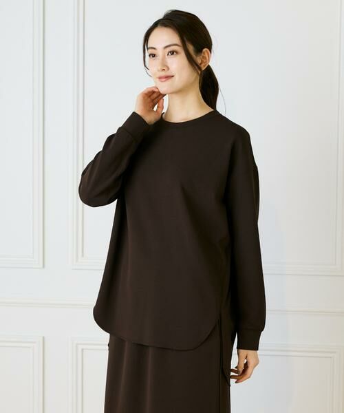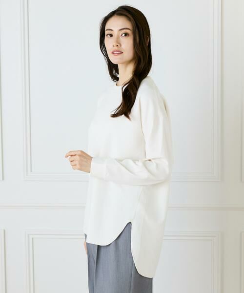 ブラウス見えしながら伸縮性のあるジャージー素材で着心地にすぐれたプルオーバー。きれいめ素材をあえてステッチワークを効かせカジュアルに寄せることでラフな印象を与える大人のカジュアルトップスです。1枚でもサマになる前後差をつけたヘムデザインや、ややオーバーなシルエットです。きれいめとカジュアル感を兼ね備えた表情でオンオフで活躍出来るアイテム。同素材のボトムと合わせるとセットアップスタイルが完成します。