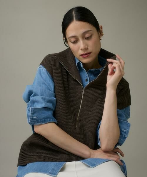 ふっくらとした畦目でリッチ感のあるハーフジップのニットジレ。シャツやカットソーに重ねてレイヤードスタイルをお楽しみいただけます。ジップを開けて衿を折り返して着ていただくのがおすすめです。ジップを閉めてハイネックとしても着ていただけます。長すぎない着丈でスカート合わせもしやすいです。