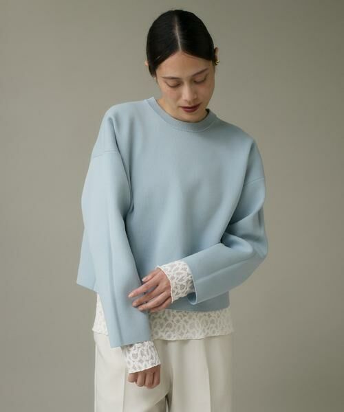 非常に細い糸を束ねた撚糸をしない糸(所々を熱で接着)の為、糸に空気を含み軽く上がります。スポンジのような軽さやふくらみ感と伸縮性が特徴の糸で、さらっとした肌触りと立体的な編地に仕上がります。