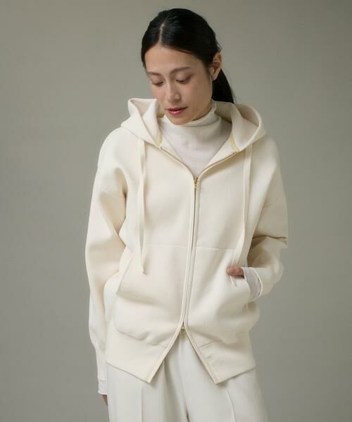 ふくらみのある素材で軽やかな仕上がりのジップアップフーディー。なめらかなニットで編み立てることで、カットソーとはひとあじ違う大人が着られるきれいめスポーティーなアイテムに仕上げました。スポンディッシュな素材ならではの立体的なフードと金属ファスナーでこなれ感を演出。コート前のライトアウターとしても重宝し、寒さが深まればアウターの中に着ていただく事もできます。内側にこっそり忍ばせた配色がポイント。スカートを合わせてカジュアルアップするのが◎