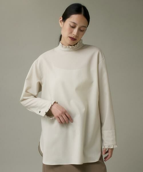衿と袖口のフリルディティールがポイントのスタンドカラーブラウス。背中心のヒヨク開き仕様がバックスタイルのアクセントにもなり、長めの着丈でヒップ回りもカバーし、一枚で様になるデザインに仕上げました。袖口は釦位置で袖巾の調節が可能です。