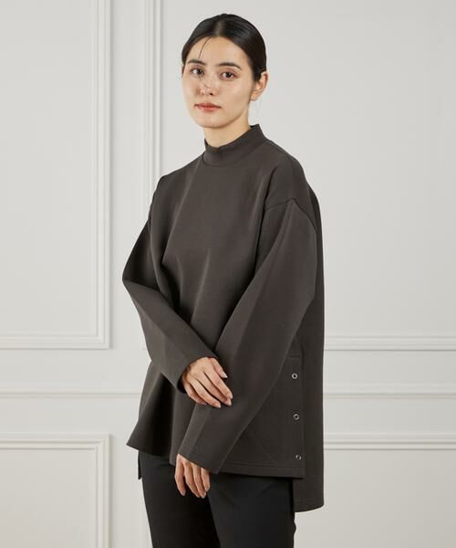 前後の着丈差をつけたデザインとサイドスリットがこなれ感を演出してくれるプルオーバー。サイドスリットにはドットボタンをあしらい、スリットの深さやシルエットを調整できるため様々なスタイリングを楽しめます。ファスナーを付けることですっきりとしたハイネックと適度なワイドシルエットが今年らしいラフさを一枚で叶えてくれます◎パンツスタイルはもちろん、Iラインスカートともバランスが取りやすく、重宝すること間違いなし!