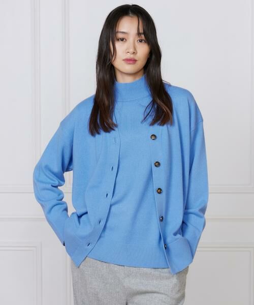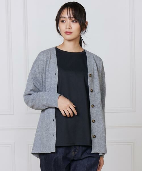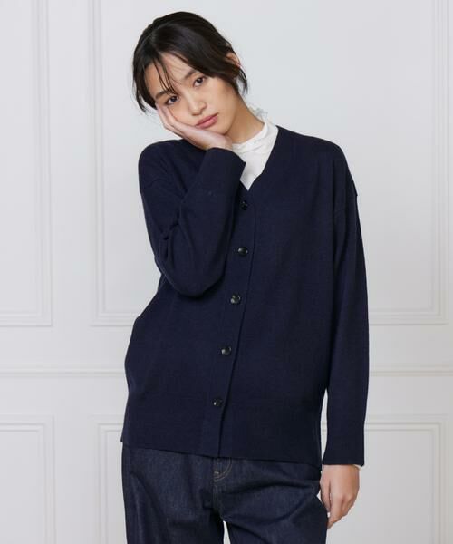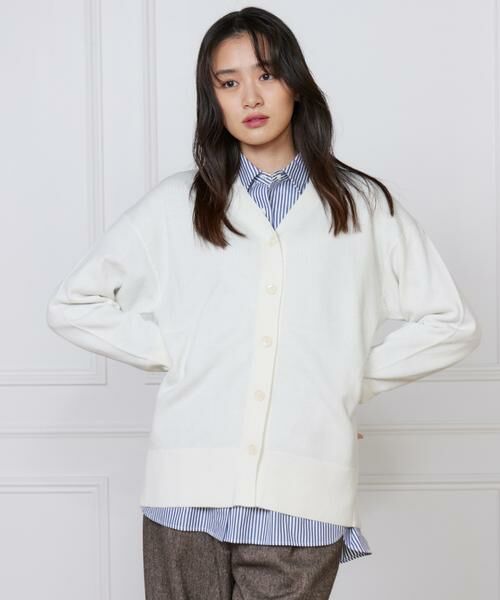 ゆとりのあるシルエットのVネックカーディガンです。衿と前立てはアウトリンキング仕様になっており、シンプルだからこそ細かいデティールにこだわりました。やや長めの丈にすることでリッチ感を出しています。脇線を前振りにし、ラウンドヘムにすることで後身頃にたまりができてこなれた着こなしになります。