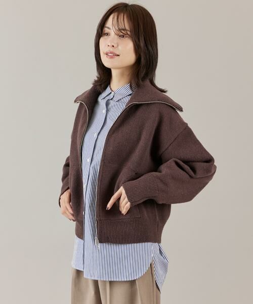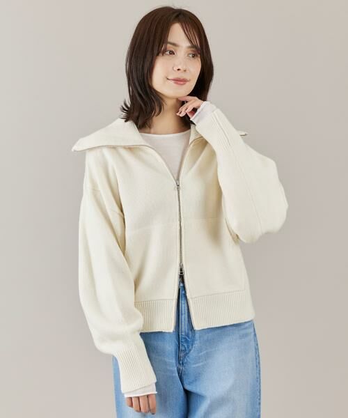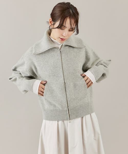 大き目の立体的な襟が特徴のニットブルゾン。襟はボディより糸の本数を増やして編み立てることでジップを開けてもを立体的にふくらみ、リッチな印象です。編み方や切り替えを凝らしたボリューム袖はニットならではの仕上がり。しっかりとした編地でアウターとしてはもちろん、コートインするスタイリングもおススメです。大きめのアウトポケットもポイントです。