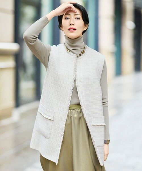 オンオフ使える上品で華やかなミックスツイードジレ■デザインボクシーながらややコクーンシルエットのツイードジレです。タイト過ぎないサイズ感で、程よいリラックス感を感じられる素材と共フリンジがアクセントになっています。同素材のパンツ(PRWMGS0010)と合わせてセットアップで着て頂くのはもちろん、セレモニーシーンやカジュアルなボトムを合わせてデイリーにも活躍します。■素材カラーミックスされた糸と凹凸感のあるスラブ糸、繊細なラメ糸で華やかさを表現したラメミックスツイード素材です。軽くて柔らかく、繊細な光沢感が艶やかで、手触りも滑らかな上品なツイード素材です。■同素材アイテムジャケット(JKWMGS0010)パンツ(PRWMGS0010)
