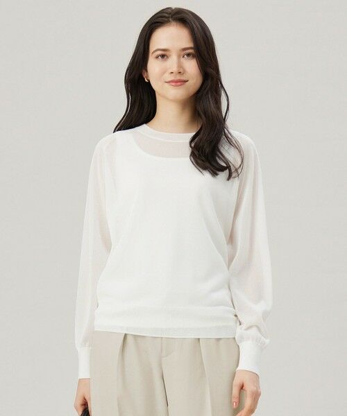 品よくトレンドを取り入れられる大人のシアーニット■デザイン上品な透け感にこだわったシアーニットです。涼しげな見た目で程よく肌離れし、キレイめでありながらリラックスしたシルエットです。ボトムを選ばず合わせやすく、シアーな素材がトレンド感のある1着です。■素材アセテートを主原料とすることで合成繊維のようなギラギラとした光沢がなく、セミマットで上品なシアー感を表現した繊細なニット素材です。