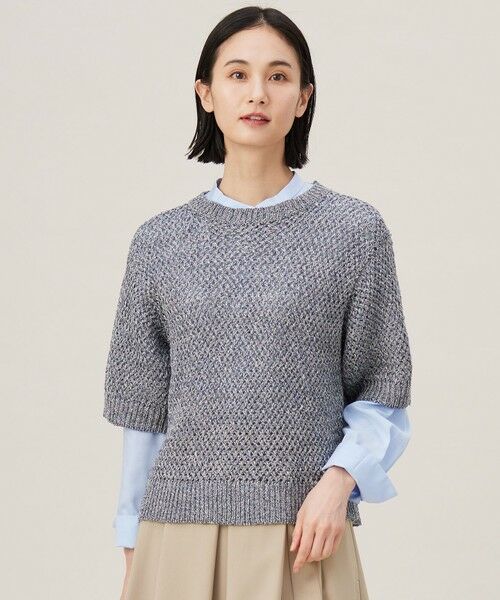 ユニークな色合いと表情のバルキーな半袖ニット■デザインバスケットのような柄編みの半袖ニットです。糸自体にユニークな色合いや表情を持つことが特徴のリネン素材を、さらに杢色にミックスし多本取りしてバルキーなファンシーニットに仕上げています。トレンド感のあるシャツとのレイヤードスタイルや、タンクトップとレイヤードしてざっくりしたメッシュ感を楽しんで頂くのもおすすめです。■素材イタリアの老舗リネン専業紡績メーカーLINIFICIO社が世界で初めて開発し代名詞となった、トップメランジカラーのリネンを使用した素材です。染色方法にこだわり、堅牢度を強固にし、オーバーダイで更に深みのある色目を表現しています。そこに繊細なラメを引きそろえて、きらりと華やかに仕上げています。
