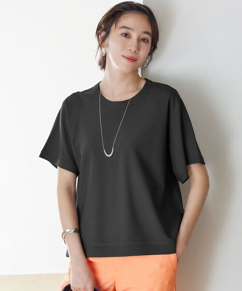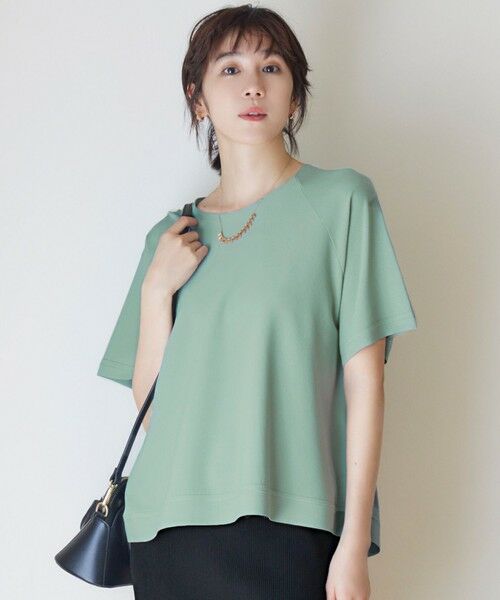 立体的なフレアが女性らしいブラウスライクなニット■デザイン立体的にフレアの入った、しなやかで程よいボリュームのAラインが美しいニットです。共素材のテープを裾にたたきつけてフォルムが綺麗に出るように繊細に仕上げているので、女性らしい印象です。着丈に前後差があるので、スカートにもパンツにも合わせやすいデザインです。■素材レーヨンとストレッチポリエステルを撚糸した糸を使用しております。ストレッチ性があるので動きやすく、身体に馴染みやすいのでストレスフリーな着心地です。撚りを強くかけているので、表面がクレープ状になっており、ドライタッチなシャリ感と清涼感がありながら、エレガントなドレープ性を合わせ持った素材です。接触冷感、UVカット機能付きです。■同素材アイテムプルオーバーニット(KRWMCM0452)カーディガン(KRWMGM0453)レースコンビニット(KRWMGM0454)