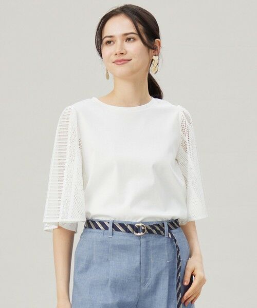 1枚で着映える、上品なレースのフレア袖トップス■デザイン上品な印象の浅めな襟のラインと、レースのフレアスリーブが女性らしいトップスです。シンプルな身頃に、程よいボリュームと今年らしい透け感のある袖が華やかで、二の腕周りもカバーしてくれます。前後差をつけたヘムラインが様々なボトムに合わせやすく、コーディネートに取り入れやすいデザインです。■素材袖部分は、ドイツ製の織り機で自由区オリジナル柄を時間をかけて丁寧に編みました。3種類の素材をミックスしたナチュラル見えの仕上がりです。身頃は、綿の持つ肌触りの良さに加えて、シルケット加工を施し上品な光沢と適度なハリ感がある素材です。■同素材アイテムタンクトップセットトップス(KKWMCM0634)