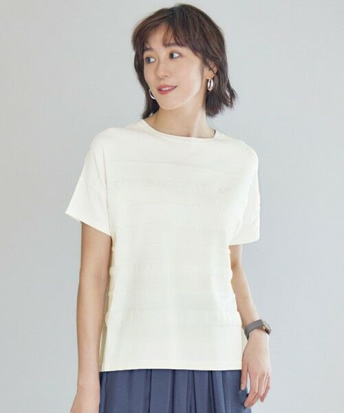 シアー素材で表現した立体的なボーダーニット■デザインシアー素材をボーダー状に組み合わせた立体的な表情のあるデザインのニットです。1枚で着やすい程よく肌離れするTシャツライクなサイズで仕上げております。スカートにもパンツにも合わせやすいバランスの万能な着丈のアイテムです。■素材レーヨンとストレッチポリエステルを撚糸した糸を使用しております。ストレッチ性があるので動きやすく、身体に馴染みやすいのでストレスフリーな着心地です。撚りを強くかけているので、表面がクレープ状になっており、ドライタッチなシャリ感と清涼感がありながら、エレガントなドレープ性を合わせ持った素材です。接触冷感、UVカット機能付きです。■同素材アイテムプルオーバーニット(KRWMCM0452)