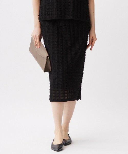 スタイリングのアクセントになるカットジャカードスカート■デザイン表情のある素材が華やかなIラインスカートです。程よくゆとりを持たせたIラインシルエットで、スタイリングが軽くなる夏に向けて華やかさを添えてくれるアイテムです。ニットなのでストレッチ性があり、イージーに着て頂けるのもポイントです。同素材のニット(KRWMGA0054)とセットアップとして着て頂くのもおすすめです。■素材シアー感とハリ感のある素材をベースに、コットンポリエステルの糸をカットジャカードでフリンジ調に施した素材です。デザイン性が高いのでインパクトがあり、涼しげで夏らしい素材です。■同素材アイテムニット(KRWMGA0054)