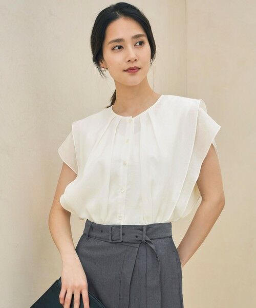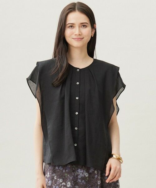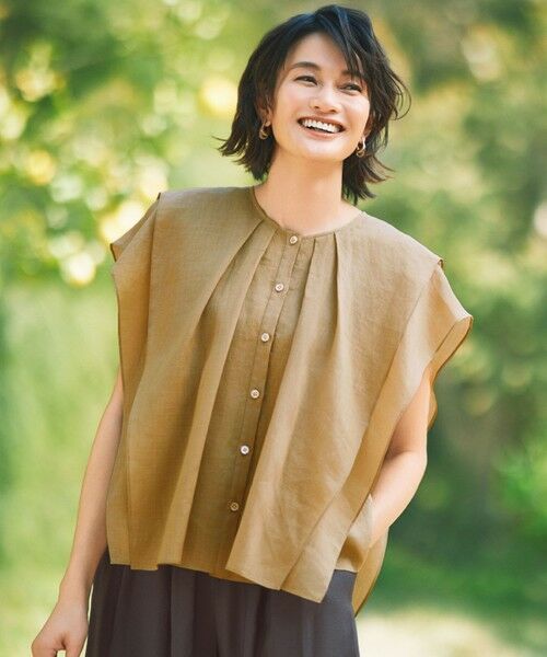 袖のタックフリルが華やかなブラウス■デザイン袖に大胆な2段のタックフリルをあしらい、身頃までドレープが出るようにデザインしたブラウスです。大きなデザインフリルが華やかで、1枚着としても存在感を際立たせてくれる1着となっております。程よい丈感なので、スカートやパンツなど様々なボトムと合わせて頂けます。■素材ハリコシのあるラミーと柔らかいセルロース系再生繊維を混紡することにより、さらりとしたドライ感がありながらもしなやかさも兼ね備えた、程よいシアー感のある素材です。天然素材であるラミーの良さを生かしつつ、きれいめに仕上げているので、カジュアルになり過ぎず大人っぽさを感じられる素材感です。さらりとしたタッチの薄地で、接触冷感機能もあるので、暑い夏にもおすすめの素材です。麻高混率でありながらも鋭利なシワが付きにくく、洗いざらしでも程よいナチュラルさで着て頂けます。■同素材アイテムクロップド丈ブラウス(BLWMGA0106)イレギュラーヘムスリーブブラウス(BLWMGA6702)フレンチスリーブワンピース(OPWMGA0105)シャツワンピース(OPWMGA6702)