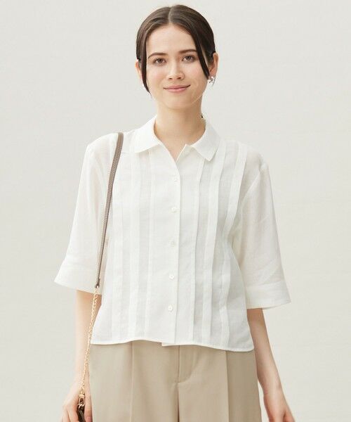 羽織りとしても活躍するゆったりシルエットのブラウス■デザインゆとりのあるシルエットと太めの袖がポイントの、クロップド丈ブラウスです。タックから生み出されるシアー素材の重なりが繊細な奥行きを感じられ、程よく華やかなブラウスになっています。ワイドパンツなどボリューム感のあるボトムを合わせて、今年らしいバランスのコーディネートもおすすめです。前を開けてワンピースなどに合わせて羽織りとしても着て頂けます。■素材ハリコシのあるラミーと柔らかいセルロース系再生繊維を混紡することにより、さらりとしたドライ感がありながらもしなやかさも兼ね備えた、程よいシアー感のある素材です。天然素材であるラミーの良さを生かしつつ、きれいめに仕上げているので、カジュアルになり過ぎず大人っぽさを感じられる素材感です。さらりとしたタッチの薄地で、接触冷感機能もあるので、暑い夏にもおすすめの素材です。麻高混率でありながらも鋭利なシワが付きにくく、洗いざらしでも程よいナチュラルさで着て頂けます。■同素材アイテムフリルブラウス(BLWMGA0105)イレギュラーヘムスリーブブラウス(BLWMGA6702)フレンチスリーブワンピース(OPWMGA0105)シャツワンピース(OPWMGA6702)