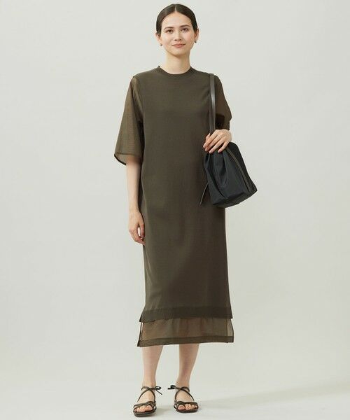 肌離れするシルエットで夏にも着て頂けるコンビ仕様のワンピース■デザインシアー素材とニットのコンビ仕様のワンピースです。すっきりとしたIラインとボリュームスリーブのコントラストで、ラフになり過ぎないキレイめな印象です。体のラインを拾いにくくするために、程よい厚みでお作りしました。厚みを残しつつ暑い時期でも着て頂けるように、程よく肌離れするシルエットになっています。■素材ニットは、肌触りの良いセミマットなPIMA綿に合繊素材を巻いた、軽くすっきりとした質感のコットンブレンド糸を使用しています。さらりとした肌触りで真夏の直前まで着て頂ける素材です。部分使いのシアー素材は、適度なハリ感とナチュラルな表情が特徴のエレガンスな印象の素材です。■同素材アイテムプルオーバーニット(KRWMGA0251)
