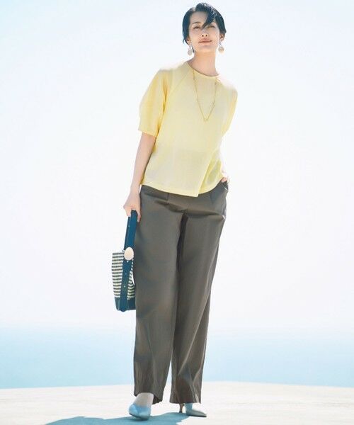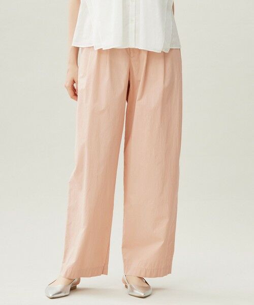 キレイめな素材をカジュアルにこなすタック入りパンツ■デザイン程よい肉感のシャツ地で仕立てた、タック入りのカジュアルパンツです。ほんの少しカーブするようなシルエットで、ワイドストレートとは違った今年らしいシルエットです。ウエストは横から後ろにかけてゴム入りなので着心地も快適です。綿のタイプライター素材に太番手のステッチを効かせることで、しわの似合うカジュアルな仕立てになっております。綿100%のさらりとしたタッチのキレイめな素材で、大人っぽいカジュアルスタイリングを楽しんで頂けるボトムです。■素材綿のタイプライター素材に特殊な加工を施すことで、表面の毛羽を抑えしなやかな風合いを出した素材です。タイプライターならではのハリ感を残しつつ程よくしなやかな風合いは、美しいシルエットを表現しながら体になじみます。薄すぎず厚すぎない肉感で暑い夏のボトムとしても心地よく着て頂ける素材感です。