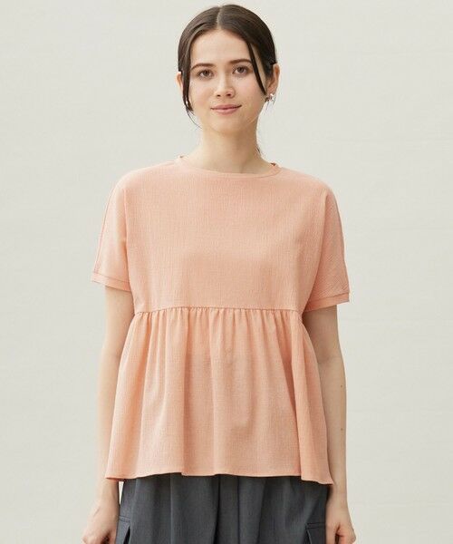 表情感のある素材を使用したペプラムシルエットのカットソー■デザインふんわりと膨らむペプラムシルエットのカットソーです。パッとかぶるだけでブラウスのような華やかできちんとした印象になります。ジャージならではの着心地やお手入れのしやすさをキープしながら、1枚でスタイリングが決まるデザインです。裾が程よく広がっているので、ワイドパンツやテーパードパンツ、タイトスカートなど、様々なものと合わせて着て頂けます。■素材特殊な編み機を使用し、織物のように経糸に緯糸を絡ませて編んでいくため、織物より密度が詰まっておらず軽量なことが特長です。ポリエステルと綿を交編し、さらにリネンをいれることで独特の組織感のある素材になっています。■同素材アイテムブロッキングカットソー(KKWMGA0232)