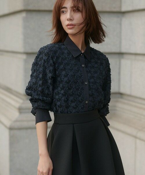 華やかなカットジャカード素材でコーディネートが決まるブラウス■デザイン身頃と袖部分に華やかなカットジャカード素材を使用した、トレンドのクロップド丈ブラウスです。襟とカフス、前立てに使用した同色の無地生地とジャカード素材が、程よく素材コントラストを効かせたデザイン性の高い1着です。エレガント過ぎないデイリーに着まわせる幾何柄のカットジャカードで、シンプルなボトムに合わせるだけで華やかなコーディネートが完成します。少し前後差のある着丈なので、クロップド丈でありながらも腰回りを程よくカバーするバランス感で、ワイドパンツやスカートなどボリュームのあるボトムと好相性です。■素材ジャカード素材は、タテ糸に細番手のナイロン、ヨコ糸に綿キュプラを使用しております。ナイロンの透け感、光沢感と綿糸のナチュラル感、マットな素材感のコントラストが印象的な素材です。たっぷりと毛足の出た表情で、幾何柄でありながら華やかな印象になっています。無地部分は、タテ糸にアセテートとレーヨン、ヨコ糸にオーガニックコットンを使用したサスティナブル素材です。薄地でありながらも繊細なシャンブレーで表現されたカラーが奥行きを感じられリッチな印象になっています。しなやかで涼し気なタッチと、適度なツヤが上品で、大人っぽい素材です。無地部分タテ糸のアセテートはFSC認証、ヨコ糸のオーガニックコットンはGOTS認証を取得しています。■同素材アイテムプルオーバーブラウス(BLWMGW0309)