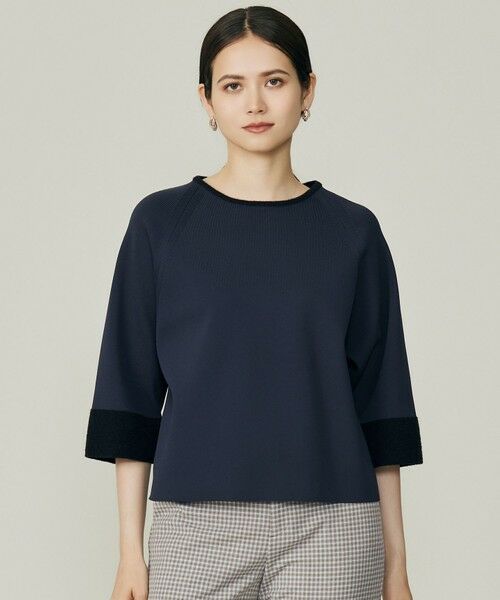 異素材のブロッキングが特徴のフェミニンなニット■デザインすっきりとしたコンパクトなボディーに対して、程よくボリュームを持たせた袖がフェミニンなバランスのニットです。襟と袖口にモールをブロッキングすることで華やかな印象に仕上げています。同素材のスカート(SKWMGW0358)とセットで着て頂くのもおすすめです。■素材軽量ながらボリューム感があり、しなやかで程よい光沢感が特徴のポリエステル糸を使ったハイゲージニット素材です。素材の持つ微光沢と切り替えに使用している微光沢のあるモール素材が華やかさをプラスしています。■同素材アイテムスカート(SKWMGW0358)