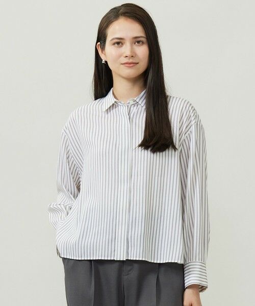 ドルマンスリーブと裾テールが女性らしいブラウス■デザイン袖下にゆとりをもたせたドルマンスリーブのブラウスです。レングスは短めでコンパクトになっています。裾のテールが女性らしく、パンツやスカートどちらにも合わせやすいデザインです。袖の短冊には、自由区ロゴの刺繍を施しております。前を開けて、さらりと羽織りとしても着て頂けます。■素材ポルトガルのSOMELOS社で織り上げた、セルロース系再生繊維100%のブラウス素材です。ストライプは自由区別注柄です。丁寧に織り上げられ、しなやかさ、ドレープ感、程よいハリ感の全てがバランス良く計算しつくされた仕上がりとなっております。ソフトな風合いで肌触りが柔らかく、シルクのような光沢感、清涼感があるため暑い夏でも着心地の良い素材です。■同素材アイテムバンドカラーブラウス(BLWMGW0311)