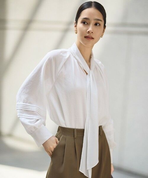 華やかボウタイがアクセントになるブラウス■デザイン大胆なボウタイディテールがポイントのデザインブラウスです。ラグランスリーブとタックのデザインも女性らしく、より華やかな印象です。ボリュームスリーブにはタックを効かせることで、1枚着としてはもちろん、肌寒い日にはジレやハーフスリーブのアウターとのコーディネートも華やかでおすすめです。■素材軽やかで薄すぎない上品なシアー感のある、コットンライクポリエステル素材です。極限までソフトにする加工をした後に、特殊タンブラーとドライ加工を施すことで、天然タッチと合繊のしなやかさを両立させています。