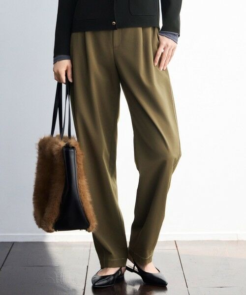 カーブの位置にこだわった立体感のあるカーブテーパードパンツ■デザイン裾に向けて大きくカーブしたシルエットのカーブテーパードパンツです。脇線を前に振ってフォルムをより立体感のあるカーヴィーなシルエットにしています。腰付近はすっきりとフィットして女性らしく、脇のカーブを高く持ってくることで、トレンド感を出しながら脚のきれい見えが叶うシルエットにこだわってお作りしました。※モデル画像はサンプルを使用しております。ブラウン(035)は実際にお届けする商品はステッチの色が生地と同色になります。正しい仕様は物画像(モデル画像ではない画像)をご参照ください。■素材スパンポリエステルと細番手メリノウールの混紡糸を使用した、ウール混できれいめなデニムライク素材です。裏糸に白い糸を使用し、表からその糸が少し見えるようにすることで、デニム調のシャンブレー感を表現しています。ウォッシャブルで洗ってもシワになりづらく、ストレッチ性もある素材です。■同素材アイテムジャケット(JKWMGW0407)ワイドパンツ(PRWMGW0407)ワンピース(OPWMGW0407)