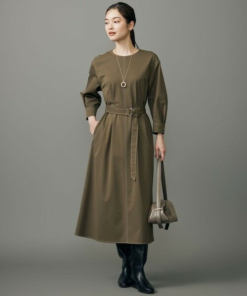 すっきり見えが叶うシルエットのデニム調ワンピース■デザインしなやかなタッチのウール混デニム調素材でお作りしたノーカラーのワンピースです。フォルムを出したお袖でカジュアルになり過ぎない大人っぽい印象の1着です。ウエストにダーツとタックを入れることで、ゆとりがありながらもすっきりと見えるシルエットになっています。共のベルトでウエストマークしての着用もおすすめです。※画像はサンプルを使用しております。ブラウン(035)は実際にお届けする商品はステッチの色が生地と同色になります。ダークインディゴ(075)は実際にお届けする商品はウエスト部分のステッチの色が生地と同色になります。■素材スパンポリエステルと細番手メリノウールの混紡糸を使用した、ウール混できれいめなデニムライク素材です。裏糸に白い糸を使用し、表からその糸が少し見えるようにすることで、デニム調のシャンブレー感を表現しています。ウォッシャブルで洗ってもシワになりづらく、ストレッチ性もある素材です。■同素材アイテムジャケット(JKWMGW0407)カーブテーパードパンツ(PRWMGW0408)ワイドパンツ(PRWMGW0407)