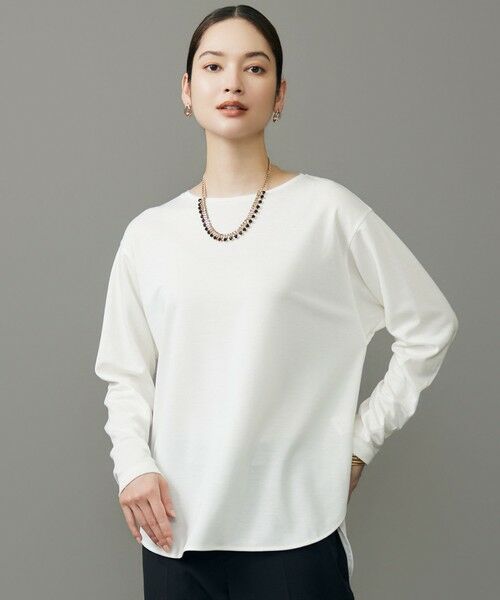 大人っぽい上品な光沢感が特徴のカットソー■デザイン光沢が上品に引き立つ大人っぽい印象のカットソーです。着丈に前後差があるので1枚でもサマになります。たっぷりとしたニットを上に重ねてインナーとしても活躍する、合わせやすいトップスです。■素材ドレープ感がありながら適度なハリ感もある、上品な印象の素材です。シワになりにくく、型崩れしにくいのが特徴です。無駄な毛羽を抑えたクリアな表面感にこだわっています。