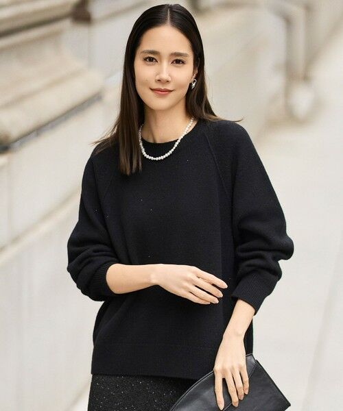繊細なスパンコールがさりげない華やかさを演出するニット■デザイン身頃は程よいリラクシーなシルエットのラグランスリーブニットです。マニッシュに見えがちなラグランスリーブも、レングスに前後差を付けることで、着用時に丸みが出て女性らしい柔らかな印象になります。レングスバランスもボトムを選ばず合わせやすいので、デイリーに活躍する1枚です。■素材オーストラリア産メリノウールと、中国・内モンゴル産の上質なカシミヤを使用しており、非常に柔らかい手触りが特徴です。上品で繊細に見える梳毛と軽く温かい紡毛、異なった手法で紡績した2種類の糸を絶妙なバランスで撚り合わせています。そのため、すっきりとした表情でありながらも、着用時にとても軽く温かさを感じられる素材です。特殊な紡績工程を経てウールとカシミヤという肌に優しい天然素材を組み合わせることで、より軽量で繊細な糸が出来上がります。そこに極小のスパンコールを撚り合わせて、華やかに仕上げています。■同素材アイテムスパンコールハイネックニット(KRWMGW0554)ラグランスリーブニット(KRWMGW0551)ハイネックニット(KRWMGW0553)【ウールマーク認証について】ウールマーク認証とは、厳しい品質基準を満たしたウール製品を証明するマークです。第三者の認定検査機関を通じて、ウール混率・耐久性・洗濯試験などを検査し、ザ・ウールマーク・カンパニーが設定する品質基準を満たした製品にのみ付けられるマークです。【メリノウールについて】主にオーストラリアで飼育されているメリノ種という?の?で、他品種の?より細く滑らかなウール繊維が特徴。??は発熱?や保温性、吸放湿性などに優れており、機能性と上質でしなやかな肌触りを両?しています。