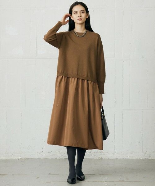 1枚でサマになる異素材ワンピース■デザイン1枚でニットと布帛のスカートを着用しているようなデザインワンピースです。フィットしすぎないすっきりとしたシルエットで着て頂きやすいアイテムです。やや細い糸を使用して、下がりきらない気温感の時期にも着て頂ける厚みに仕上げました。イギリスの老舗ティーハウスFarrer’s(ファーラーズ)とのコラボレーションアイテムです。【Farrer’s】英国湖水地方で200年以上続くティーハウス。ホテル、レストランをはじめ現地の方々に愛される紅茶は、軟水向けにブレンドされているため、日本でも変わらない味が楽しめます。歴史ある建物でもあるティーハウスでは、美味しい英国菓子や紅茶を求め、連日お客様で賑わっています。■素材しなやかなウールと、糸に撚り戻しをかけ膨らみと軽さが特徴のバルキーアクリルをブレンドした糸で、適度にハリとコシのある中肉のミラノリブを作りました。コンパクトですっきりとした肌触りです。■同素材アイテムランタンスリーブニット(KRWMGW0557)スカート(SKWMGW0556)