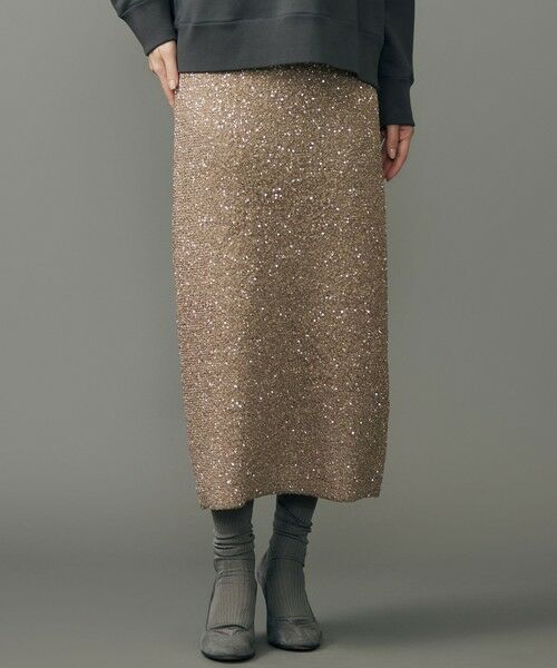 煌めくスパンコールがコーディネートを華やかにするスカート■デザイン密度高く施されたスパンコールがキャッチーなスカートです。シルエットはすっきりとしたIラインですが、タイト過ぎない肌離れするバランスになっています。裏にはスパンコールが肌に当たらないように膨らみのあるストレッチ糸を接結編みにして、着用感の良さにも気を配った商品です。■素材スパークタイプのポリエステル糸にスパンコールを高密度に撚糸した素材です。近年トレンド傾向のスパンコール糸を使用した華やかな素材です。※画像はサンプルを使用している為、実際にお届けする商品と仕様、加工、サイズが若干異なる場合がございます。予めご了承ください。※撮影環境の都合上、実際の商品と色味が異なって見える場合がございます。洗濯表示【本体のみ】40℃まで手洗い可 塩素系漂白不可 タンブル乾燥不可 日陰平干し乾燥 アイロンは160℃まで 弱いドライクリーニング(石油系)可 弱いウェットクリーニング可