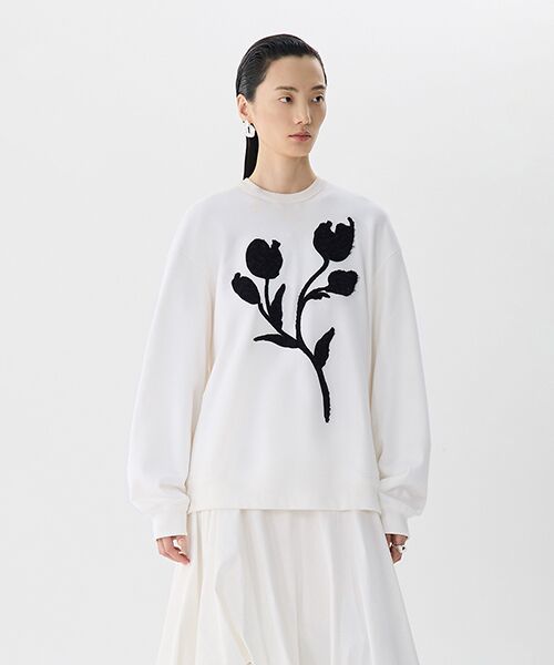 ふんわりと立体感のあるフラワーモチーフが印象的なスウェットシャツ。ドロップショルダーとゆったりとしたシルエットで、リラックスした着心地を楽しめるデザインです。カジュアルながら華やかさをプラスする一着で、デイリースタイルにぴったり。