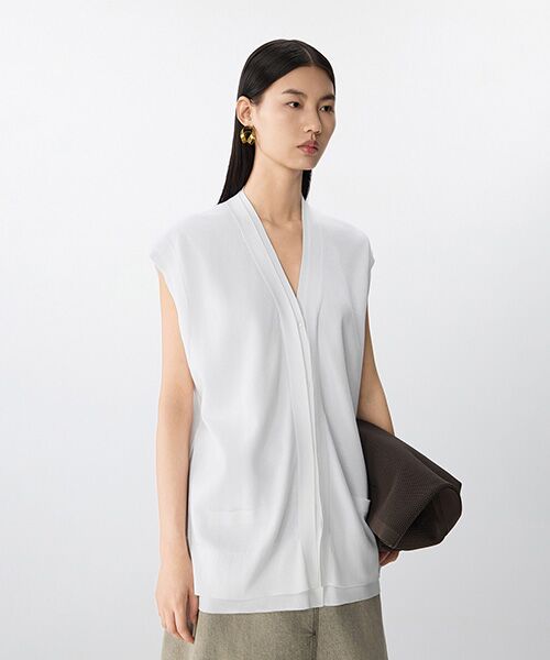 二重仕立てがさりげなく効いた、ミニマルモードなニットベスト。袖口と前立てに施されたレイヤー構造が、シンプルな中に奥行きをもたらします。やわらかなコットン素材は肌なじみが良く、通気性にも優れているため、シーズンを問わず快適な着心地。シャツやカットソーとのレイヤードで表情を変え、デイリーからオフィスシーンまで幅広く活躍する、スタイリング力の高い一着です。
