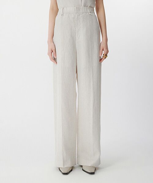 リラックス感あふれるリネン素材のワイドパンツ。天然素材ならではのナチュラルな風合いが魅力で、シンプルながらも洗練された佇まいを演出します。同素材のベストと合わせたセットアップスタイルは、抜け感ときちんと感を兼ね備えた大人の装いに。※生地に見られるネップは、リネン特有の風合いとしてご理解ください。