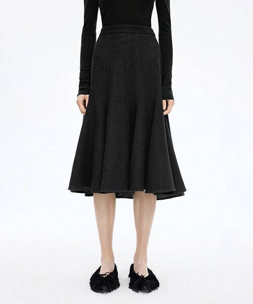 クラシカルな雰囲気漂うヘリンボーン柄のマーメイドスカート。ほどよく広がるフレアラインが、歩くたびにしなやかに揺れ、女性らしい印象を引き立てます。ウエストまわりをすっきりと仕上げ、ヒップラインを美しく見せつつ、裾に向かって自然に広がるシルエットで上品さと動きやすさを両立。厚みのあるしっかりとした生地感で、秋冬のスタイリングにぴったりの一枚です。