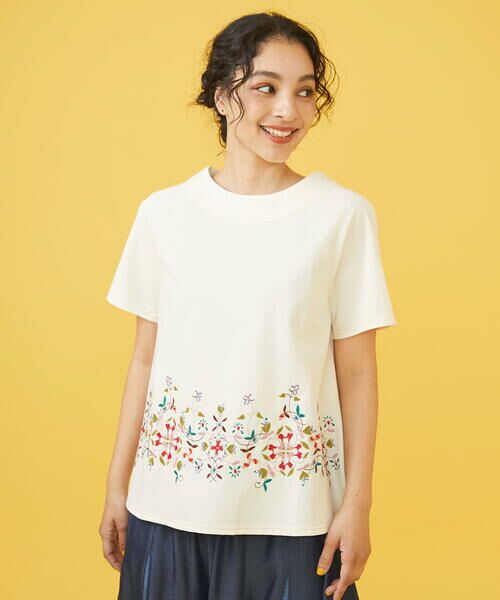 大胆にあしらった刺繍が目を惹くプルオーバーTシャツ。風が通るようなゆったりとしたシルエットです。襟ぐりの切替とラグランスリーブが大人カジュアルを演出。裾と後ろ襟の中心には幾何調のお花の刺繍を施し、華やかさがプラスされます。デイリー使いしやすいシンプルなTシャツは暑い日も快適にお召しいただける一枚です。