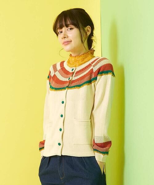 ホコモモラならではの配色が目を惹くカーディガン。ラグランスリーブとゆとりのあるシルエットで快適な着心地を実現します。襟周りのメッシュ編みが軽やかで、デザイン性の高い配色ボーダーがお顔周りを華やかに演出。袖は丸みがあり柔らかい印象に、袖口はリブですっきり見えも叶えます。身頃の切り替えと袖部分に使用しているファンシーヤーンや配色くるみボタンにも注目。嬉しいポケット付きです。クラフト感たっぷりなカーディガンは褒められる事間違い無しの一着です。