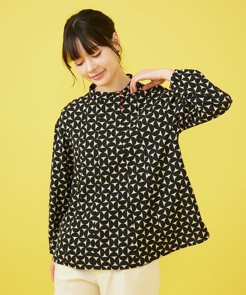 ホコモモラらしい総柄ブラウス。柄が引き立つよう無地ボトムス合わせがオススメです。デニムなどのカジュアル素材のボトムスでデイリー使いに、きれいめ素材のボトムスを合わせれば上品にまとまります。同シリーズのカーディガン【GJSDB02220】を羽織ったスタイリングもマッチします。