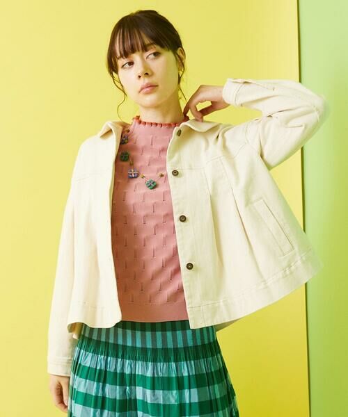 お顔周りを明るく見せてくれる優秀ジャケット。ベーシックなアイテムはホコモモラ初心者の方にもオススメで、カラフルなプリントアイテムともマッチします。同素材のパンツ【GJLDB42180】とのセットアップもワンランク上のコーディネートに。ワンピースやカットソーなどお好みのアイテムに羽織ってお楽しみください。