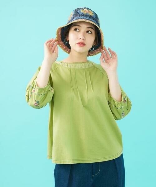 袖口の刺繍がポイントのカットソー。袖に丸みがあり、襟ぐりにヨークを入れたブラウスライクなデザインです。ゆったりした身頃とラグランスリーブのリラクシーなシルエット。袖丈はロングシーズン着用いただける半端袖タイプで、袖口の花刺繍がアクセントに。異素材を使用し切り替えを入れた袖と首元のデザインにも注目です。首元の開きが少なくオーバーサイズ見えせず小柄な方にもオススメです。