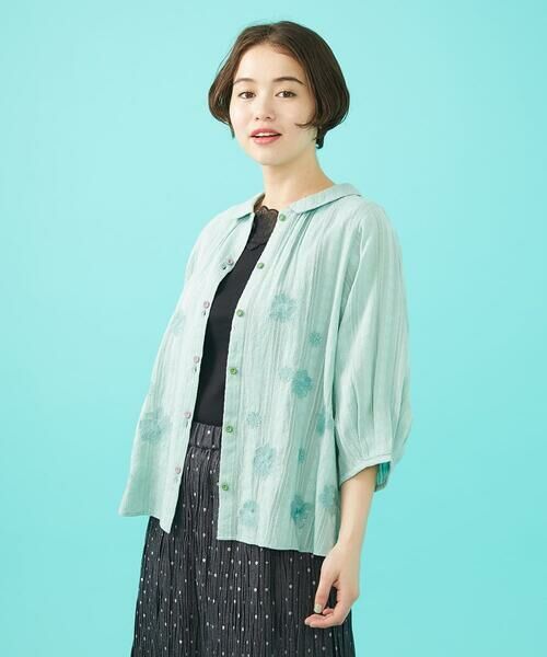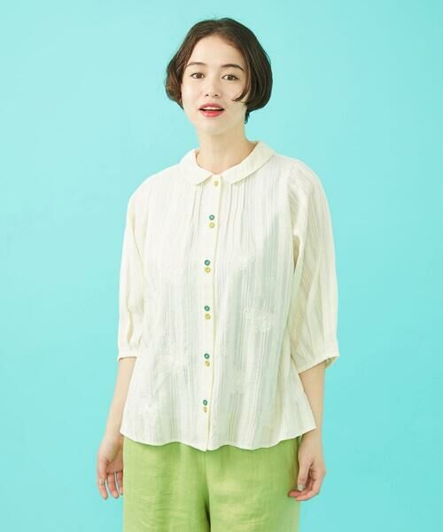 フラットカラーが大人かわいいブラウス。様々なボトムスに合わせやすい丈感で、袖や裾口に丸みのあるシルエットです。胸元から裾にかけてお花の刺繍を施したデザインに、配色の飾りボタンでホコモモラらしい雰囲気をプラスしました。肘まですっぽりと隠れる半端袖タイプ。小さめな襟で普段に使いやすく羽織りとしてもお使いいただけるブラウスは、寒暖差が気になる時期にも活躍間違いなしです。