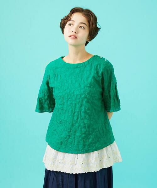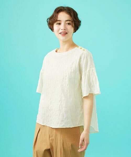 生地のポコポコ感が大人かわいいブラウス。袖や裾にかけて広がりのあるシルエットで、Tシャツのような快適な着心地です。丈に前後差があり、さりげない体型カバーが叶います。生地にはリップル加工によって不規則なドット柄の凹凸を作り出し、動きや立体感を感じられるデザインにお仕立てしました。カジュアルでありながら女性らしい印象を与えられる一着。肩に並んだ配色ボタンにも注目です。