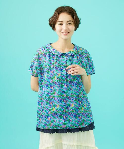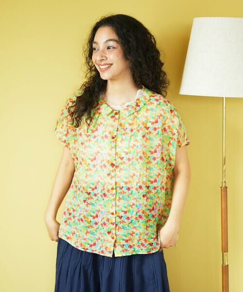 カラフルなプリント柄が目を惹くブラウス。体のラインを拾いにくいボックスシルエットです。小さめにお仕立てしたフラットカラーがほどよくきちんと見えを実現。フレンチスリーブと袖口のタックで女性らしい印象を後押しします。柄に合わせた同色系のボタンで着脱できるのも魅力に。