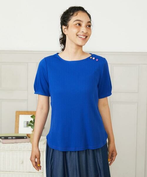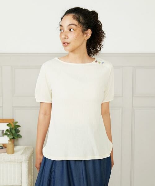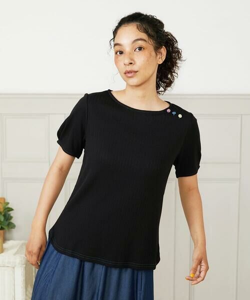 肌触りの柔らかなTシャツ。丸みのある袖とほどよいゆとりがフェミニンな印象を与えるシルエット。動きやすく、体に馴染みやすい柔らかな生地でお仕立てしました。肩のラインにぴったり合わせて縫い付けたセットインスリーブデザインで、腕まわりに自然な立体感を演出。袖口に入れたタックと、首元に三つ並んだ配色のくるみボタンがポイントです。そのうち一つのボタンに施した刺繍にもご注目ください。