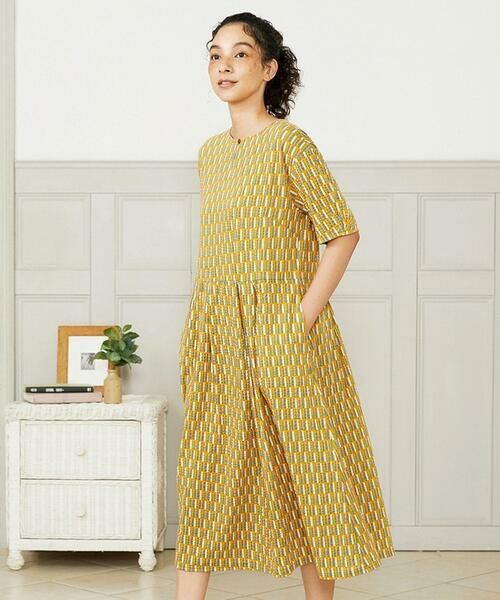 生地の凹凸感とカラフルなプリント柄が大人かわいいワンピース。体のラインを拾いにくいAラインシルエットです。袖口のタックでふんわりとさせ、締め付け感の少ないストレスフリーな着心地が魅力ポイント。ウエスト切り替えからタックを入れたデザインで、さりげない体型カバーが叶います。生地にはリップル加工によってストライプ柄の凹凸を作り出し、動きや立体感を感じられるデザインにお仕立てしました。胸元の涙開きがアクセントで、嬉しいポケット付き。カジュアルでありながら女性らしい印象を与えらえる一着です。