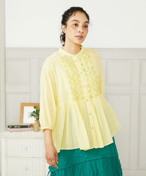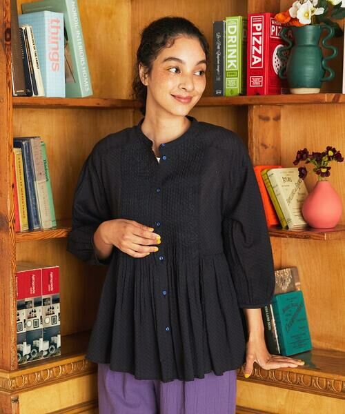 インドからやって来た、プリントをアクセントにしたブラウス。ふんわりとした袖とゆとりのある身幅で体のラインを拾いにくいシルエットです。ブロックプリント生地の胸元にピンタックを入れ、上から葉っぱの柄を施しました。バンドカラーのデザインと胸下からギャザーを入れて生み出した立体感が、女性らしい印象を演出。ギャザーや後ろのタックで腰回りやヒップのさりげないカバーも叶います。ホコモモラらしい配色ボタンにも注目です。
