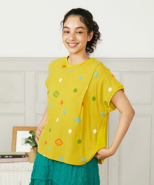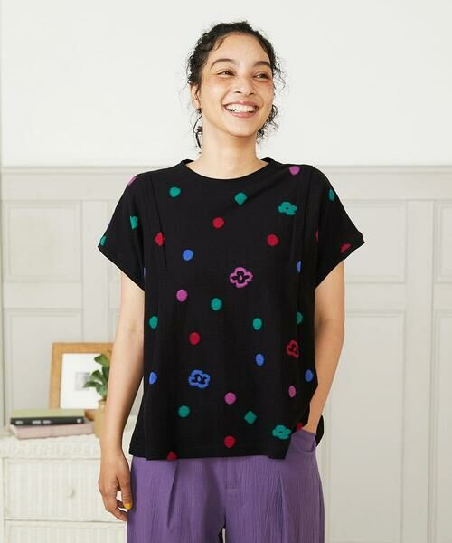 幾何調の柄が目を引くカットソー。裾に向かって緩やかに広がったフレアなシルエットです。フレンチスリーブと肩にあしらったタックが女性らしい印象を演出します。前身頃のジャカード素材に同色の天竺素材をドッキングした、異素材感が特徴的なデザインです。カラフルなお花、四角、丸の3つの形で構成された幾何調の柄は、柄が裏面に出るように設計されたバックカットジャカードで表現。立体感のある見た目とポップな配色が楽しい一枚です。
